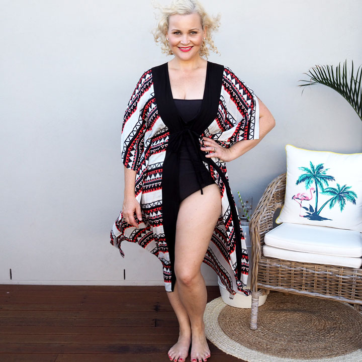 - Adding a kimono style cover up to your swimsuit wardrobe will have you feeling confident in no time. Cinch it in at the waist or leave it free flowing. Either way you’ll feel confident enough to order a cocktail before draping the kimono over your chair and walking towards the pool.